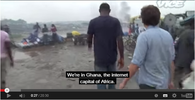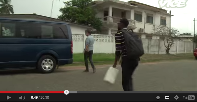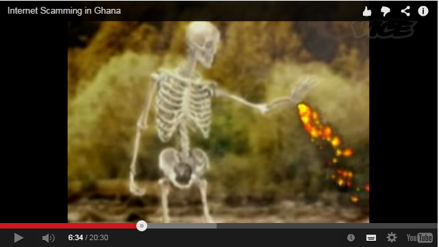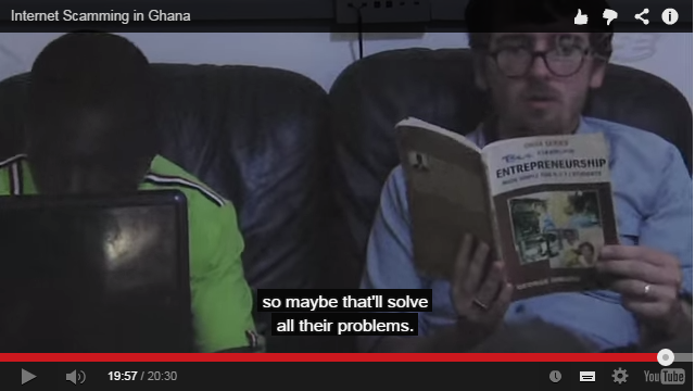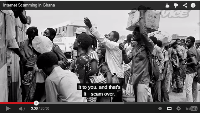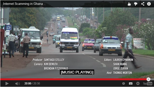 A documentary without an interview would mean nothing as we have no evidence of people experiencing what they have experienced. Thomas the presenter interviews a guy who tells us more and gives a bigger insight of what the scams in Ghana are and how they are done. Here at 2:42 he asks the interviewee what the term "Sakawa" means and the guy explains what it is. His role was to answer the questions related to the scamming that take place in Ghana. Again with the use of an interview the audience learn something new and are persuaded to believe that everything he is saying is real. For example if a person was to say something that is hard to believe we can get people to back our point up, persuading the person that the fact is actually real and is not fake. This is the same thing that happens during this interview.