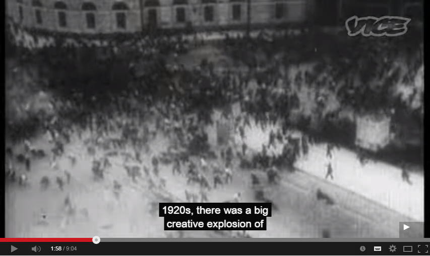 The balance between archive and original footage were staggering because within the 9 Minutes of the first part of the documentary most of them were archive footage which shows that there was not much effort put into this documentary but also in a way it engages the audience as it shows what the movies were like back in the day. An example of this is at 1.58 where he talks about the cinema in the 1920's. Again while the voice over is running we are shown archive footage relating to the whole event which gives the audience a better understanding of what happened in the 1920's in Russian. The videos guide the audience through the voice over allowing them to fully understand what Mr Shane is talking about.